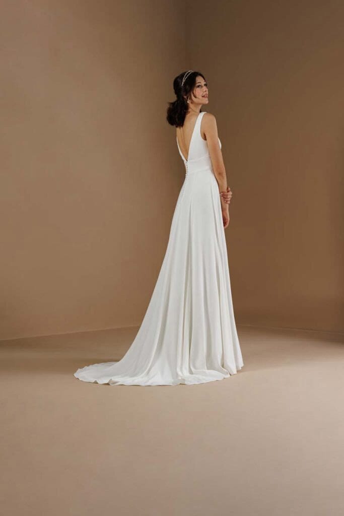 Smuk brudekjole, som har en flot blonde foroven og et lækkert chiffon skørt. Kjolen har en flot V udskæring og et fint slæb.