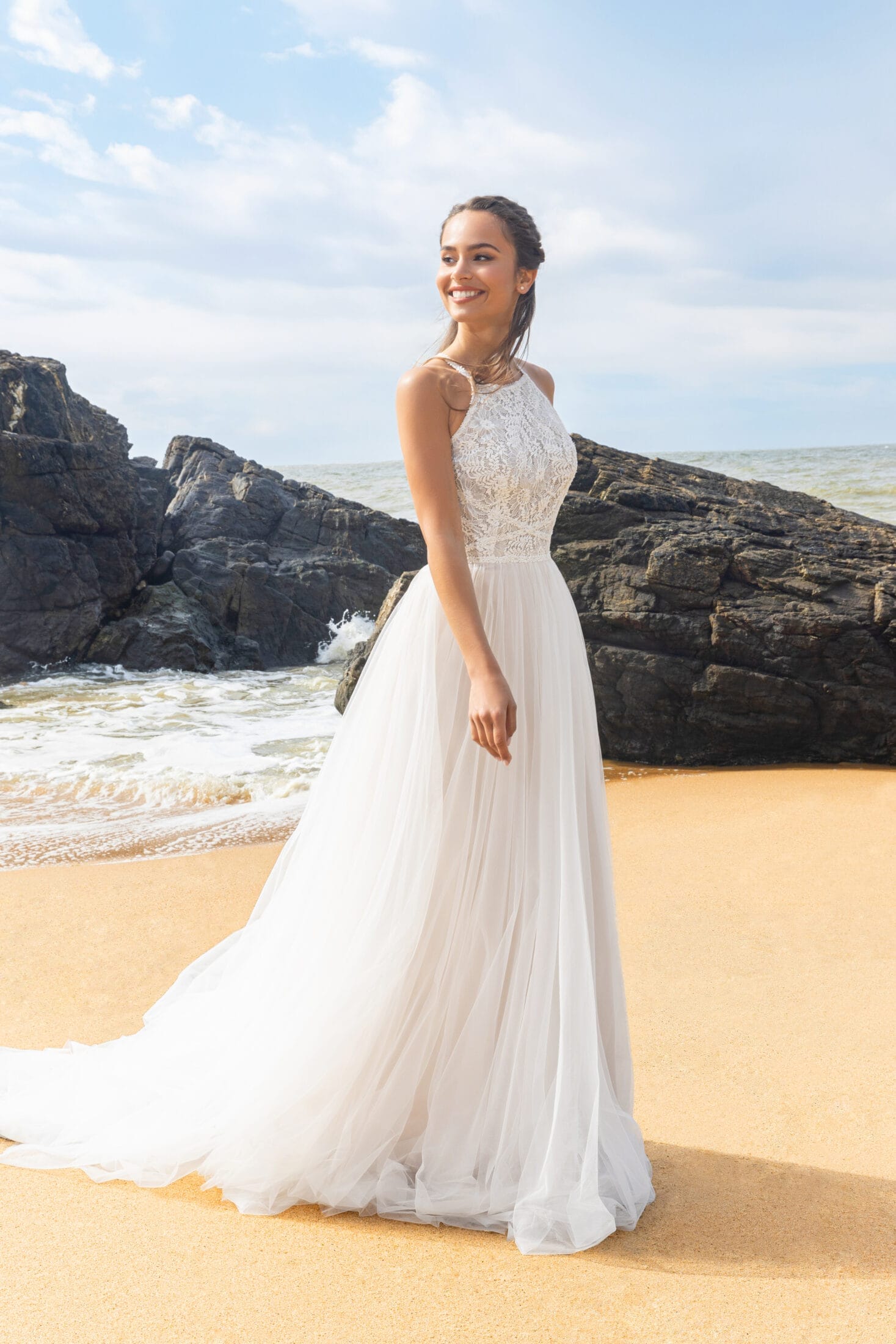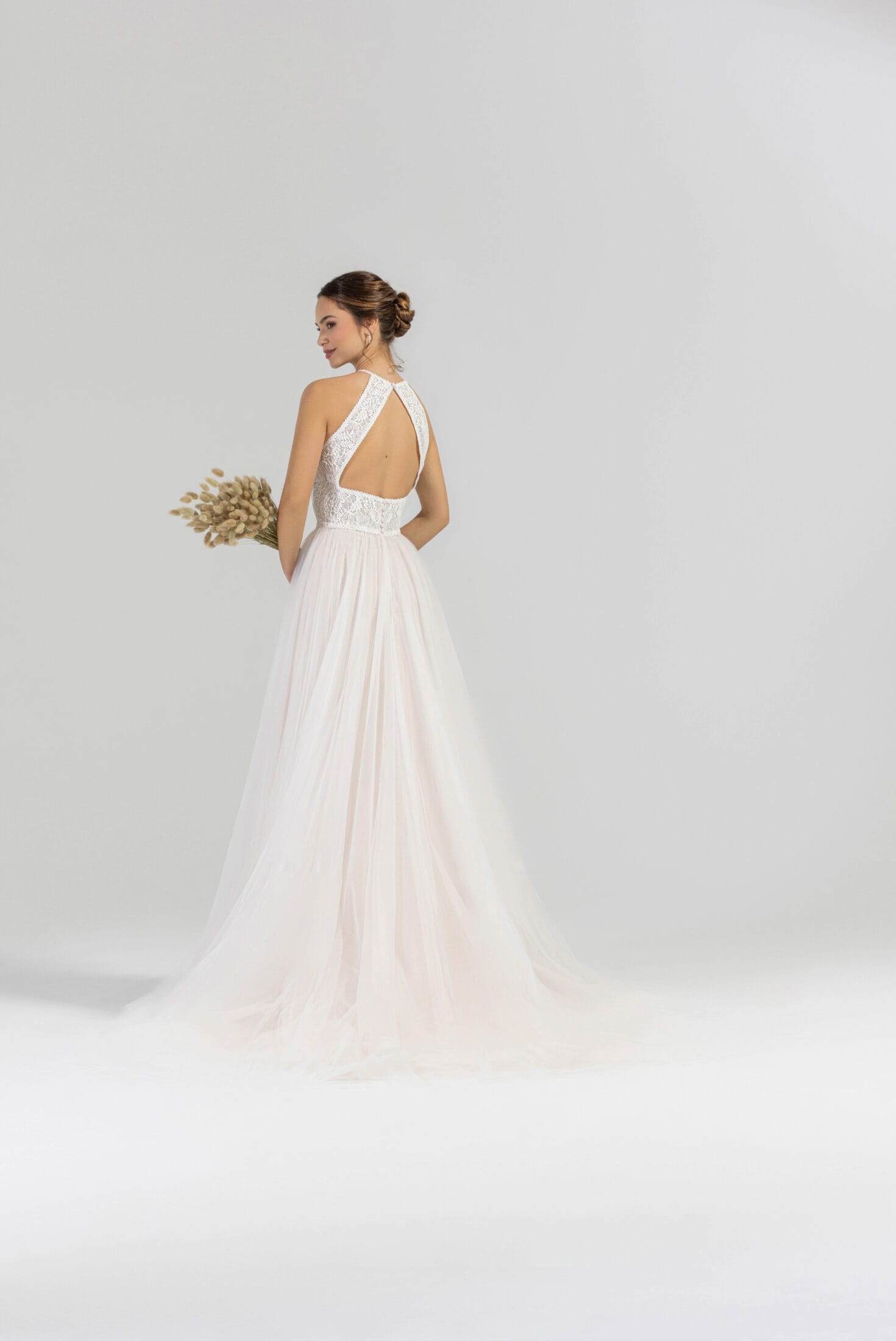 Vil du giftes i kirken, på stranden eller hjemme i haven? Så må man sige at denne smukke brudekjole kan det hele. Brudekjolen er unik med dens flotte udskræring i halsen og den smukke ryg. Brudekjolen har den sødeste blonde i overdelen og et lækkert tyl skørt i bunden.